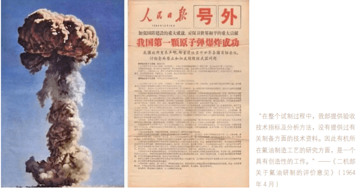 作为当时中科院化学四大家族(上海有机所、长春应化所、大连化物所、北京化学所)之一的有机所临危受命,研制和生产特种氟油(定名为“F-111”任务)。经过不懈努力,按时保质保量完成任务,满足国家的急需,为19641016日中国成功地爆炸第一颗原子弹做出重要贡献。钱三强曾赞誉这项工作让我国原子弹比原计划提前一年爆炸