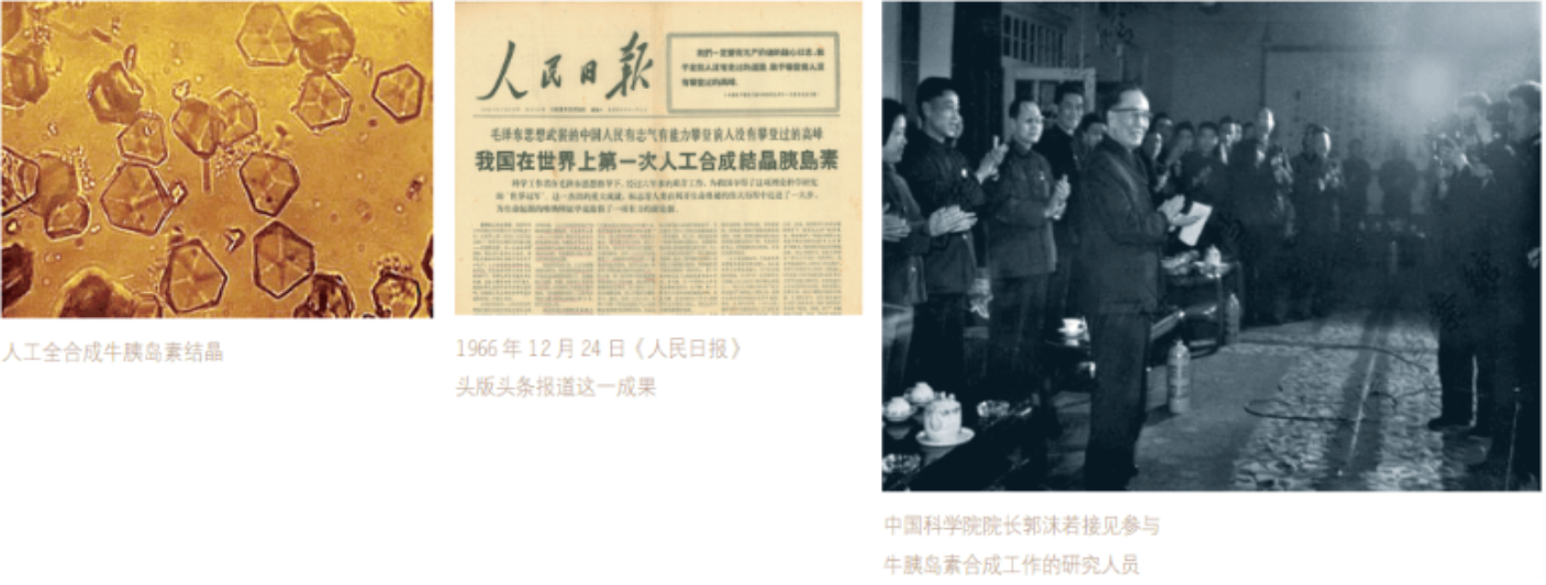 有机所与中国科学院生物化学研究所、北京大学研究人员协作,在世界上第一次用人工方法合成与天然胰岛素分子相同化学结构并具有完整生物活性的蛋白质。为人类认识生命、揭开生命奥秘迈出了一大步,使得中国在人工合成生物大分子这一基础科学领域跃居世界先进行列。