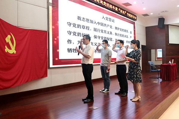 首先举行的是新党员入党宣誓仪式,在胡金波的领誓下,新党员面对庄严肃穆的党旗宣誓,全体党员起立,共同重温入党誓词。