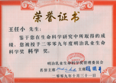 2009年度明治乳业生命科学奖评选日前揭晓,上海有机所王任小研究员荣获“科学奖”。此次共有27人获奖。颁奖典礼于2009年10月31日在中国科学院上海生命科学信息中心举行。