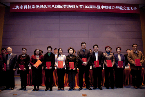 3月7日下午,上海市科技系统纪念三八国际劳动妇女节103周年暨巾帼建功经验交流大会在科技馆报告厅举行,上海市妇联党组书记焦杨,上海市总工会副主席周志军,上海市科技党委副书记陈龙以及中科院沪区党委副书记李正华等领导出席了大会。会上,有5位先进个人和先进集体代表介绍和分享了她们的体会和感想,并对荣获2011-2012年度上海市“三八红旗手(集体)”、上海市科技系统“三八红旗手(集体)”以及“心系女职工好领导”等荣誉称号的集体和个人颁发了荣誉证书。