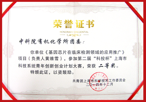近期,由上海市科技团工委举办的第二届“科投杯”上海市科技系统青年创新创业计划大赛评选结果公布,由有机所团委推荐的《基因芯片在临床检测领域的应用推广》项目(负责人黄维雪,周佳海课题组)在本次大赛中荣获二等奖。