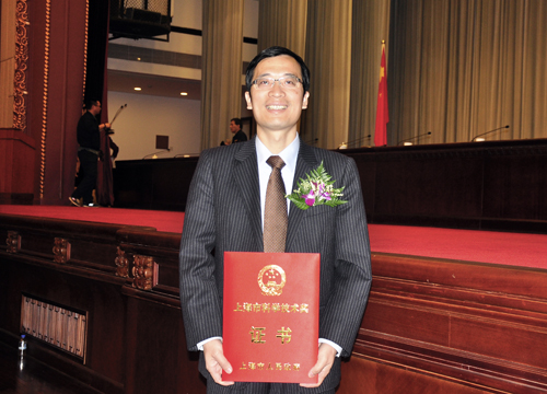 518上午,上海市委、市政府在上海展览中心友谊会堂隆重召开了2014年度上海市科学技术奖励大会。上海有机所的胡金波研究员与本市九位青年科技工作者一起荣获本届上海市青年科技杰出贡献奖。上海市领导宣读表彰决定,并为获奖者颁奖。
