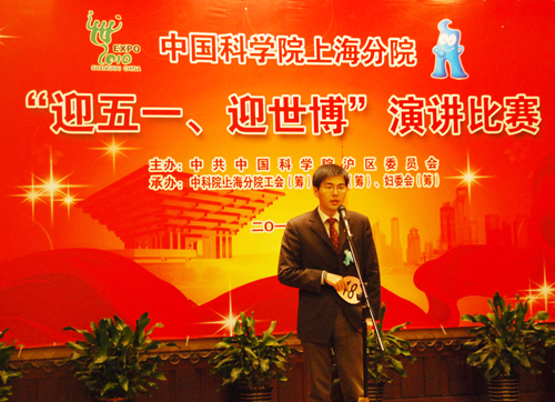 2010年4月29日下午中科院上海分院在上海学术活动中心举行了以“科技与世博”为主题的“迎五一、迎世博”演讲比赛。上海有机所党委书记郏静芳作为评委出席了此次演讲比赛。来自上海分院系统各个研究院所的20名选手参加了这次比赛。经过激烈的角逐,评选出一等奖1名,二等奖3名,三等奖5名。上海有机所研究生张延和职工陈铭代表有机所参加了比赛,展现了有机所科技青年的风采,也体现了有机所青年参与世博的热情。