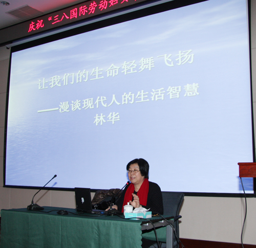 颁奖典礼结束后,上海著名作家林华女士,为我们带来了《让我们的生命轻舞飞扬一一漫谈现代人的生活智慧》的精彩讲座。“一个人的经历和悟性最终决定他的眼界 ”,“当我一切顺利时,志存高远而又要脚踏实地;当我遭受挫折时,感谢磨练,是它让我成长” , “喜欢自己,欣赏别人”,“读好书,交高人”…… 在讲座中,林华女士用优美的语言、生动的事例、富有感染力的表述和与会者共同分享了她多年的生命感悟 ,以及对现代女性素养和魅力的深刻认识,告诉我们如何才能智慧而轻盈地生活在现代都市中。将近两个小时的讲座使我们深刻感受到林华女士深厚的文化积淀和蓬勃的生活激情,她幽默而又诙谐的谈吐,优雅而又知性的气质,豁达而又开阔的视野以及她富有哲理的演讲给在座的每一位听众带来了心灵的触动,使大家受益匪浅。
