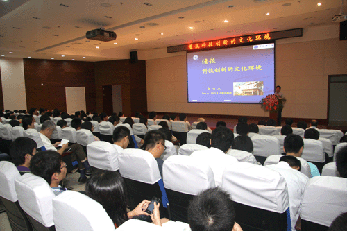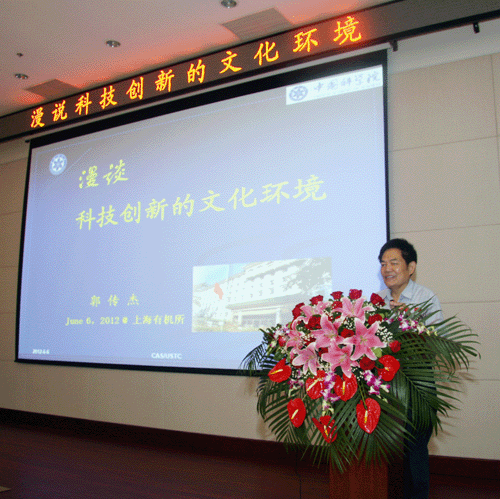 6月6日上午,上海有机所隆重举办了“黄耀曾科学与人文讲座”首场报告会,特邀中科院原党组副书记、中科大党委书记郭传杰研究员做了题为“漫谈科技创新的文化环境”的报告,报告会由党委书记郏静芳主持,有机所院士、领导班子成员、科研骨干、管理骨干、学生等200余人参加了报告会。