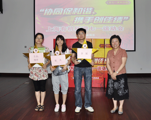 6月21日上午,在有机所君谋楼多功能厅举行了上海有机所迎七一运动会。本次活动作为有机所迎七一的系列活动之一,在所党委领导下,工青妇群众组织参与配合,来自有机所生命、金属、氟化学、天然高分子、机关、计算机学报、后勤等9个队伍参加了两个团体趣味项目的角逐。
