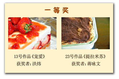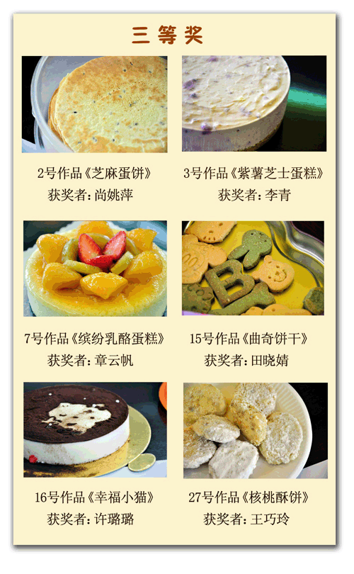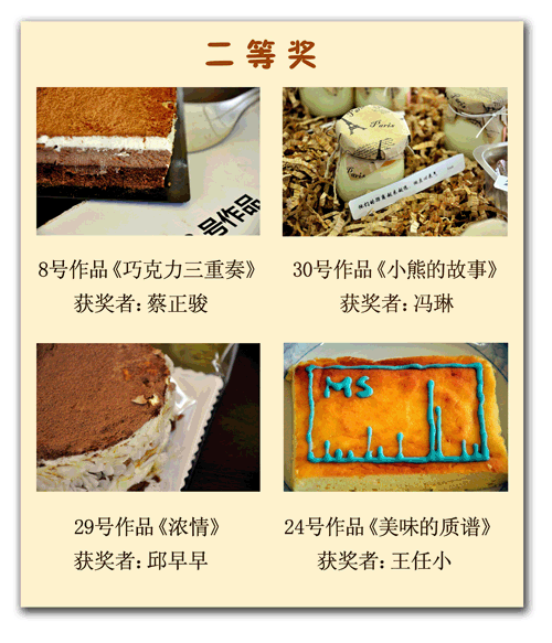 在比赛现场,评委和在场的职工拍照的拍照,发微博的发微博,场面非常热闹。戴立信院士作为评委之一,神情认真的在评分表中对每个作品写出了“外形最优”、“可口可爱”、“健康可口”、“经济适用”等点评语。最终本次创意点心烘焙大赛,评出了一等奖2名,分别是13号作品《宠爱》及23号作品《提拉米苏》,二等奖4名,分别是8号作品《巧克力三重奏》、24号作品《美味的质谱》、29号作品《浓情》及30号作品《小熊的故事》,三等奖6名,分别是2号作品《芝麻蛋饼》、3号作品《紫薯芝士蛋糕》、7号作品《缤纷乳酪蛋糕》、15号作品《曲奇饼干》、16号作品《幸福小猫》及27号作品《核桃酥饼》。