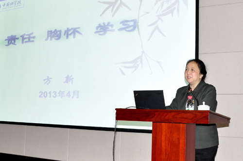 方新副书记围绕“责任、胸怀、学习”三大主题,结合十八大报告的精神,通过深刻剖析国内外形势的发展变化,阐明了科学技术创新在时代进步、国家经济社会发展和综合国力提升中的重要作用,指出在国家依靠创新驱动实现经济发展的转型路上,科技界任重道远。她引用周恩来、邓小平、王淦昌、侯祥麟、彭桓武等老一辈国家领导人和科学大家的爱国事迹,勉励广大科技工作者要胸怀科教兴国、创新为民的远大抱负,面对时代赋予科学院新的形势和使命,继续传承和弘扬科学院精神,即服务国家、造福人民的精神,追求真理、攀登高峰的精神,自强不息、艰苦奋斗的精神,淡薄名利、团结协作的精神,实事求是、科学民主的精神,坚持走中国特色自主创新道路,努力取得更多更好的科研成果,在建设创新型国家进程中进一步发挥“火车头”作用。