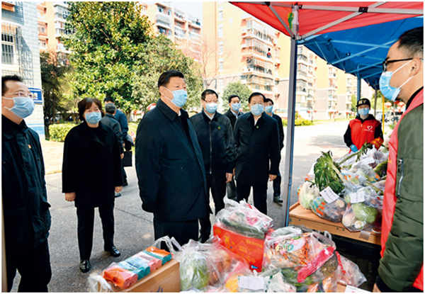 2020年3月10日,中共中央总书记、国家主席、中央军委主席习近平专门赴湖北省武汉市考察新冠肺炎疫情防控工作。这是习近平在东湖新城社区生活物资集中配送点,详细询问社区群众生活物资采购和供应情况。 新华社记者 谢环驰/摄