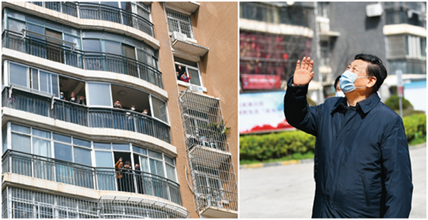 2020年3月10日,中共中央总书记、国家主席、中央军委主席习近平专门赴湖北省武汉市考察新冠肺炎疫情防控工作。这是习近平在东湖新城社区考察时,向在家隔离居住的居民挥手致意、表示慰问(拼版照片)。 新华社记者 谢环驰/摄
