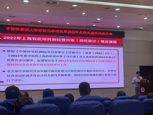 为进一步学习落实习近平新时代中国特色社会主义思想和二十届中央纪委二次全会精神,坚定不移地把全面从严治党纵深推进,加强自身建设,提高专业水平,以更加严实有力的举措推进党风廉政建设。根据分院纪检组和沪区纪委的工作安排,结合我所纪委年度工作计划,7月4日下午在君谋楼报告厅组织召开了2023年度中国科学院上海有机化学研究所党风廉政建设大会,所领导班子成员、两委委员、课题组长、各部门负责人,各支部书记副书记、纪检委员以及科研财务助理等现场参会,全所其他人员通过线上参会,交叉中心设分会场,会议由监督审计处处长黄少胥主持。