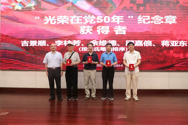 首先举行的是“光荣在党50年”纪念章颁发仪式。今年上海有机所获得该纪念章的党员分别是吉景顺、李林芳、余维德、顾嘉俍、蒋亚东(按姓氏笔画排序),唐勇所长为到场的党员同志颁发纪念章,并代表所党委向5位同志致以崇高的敬意,感谢他们为有机所发展所做出的重要贡献,希望年轻的党员同志能够学习老党员们尽职尽责、苦干实干,始终如一的政治品格,牢记入党誓言、牢记我们入党时的初心使命,为党和国家的发展奋斗终身,为研究所的创新发展增光添彩。