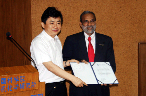 7月16日上午,上海有机所隆重举行了“中国科学院外国专家特聘研究员”证书授予仪式暨学术报告会。丁奎岭所长主持了报告会,并为美国南加州大学碳氢化学研究所的Thomas Mathew教授颁发了证书。