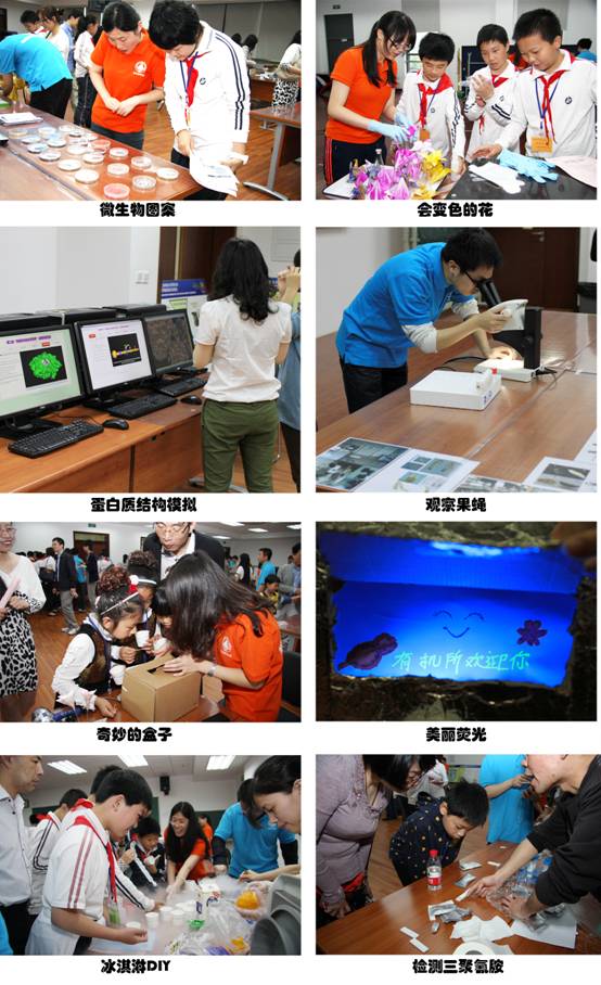 2013年5月18日,第二届“绚丽多彩的化学世界”主题科普活动在有机所君谋楼举行。整个科普活动包括6个展厅,在二楼的生命有机化学国家重点实验室展厅吸引了很多家长和同学。在展厅内,生命有机国家重点实验室的研究生志愿者们为来访参观的同学们准备了各种各样的生动有趣的实验:会变色的花、TLC得到分开的点、快速检测牛奶中的三聚氰胺、显微镜观察果蝇、各种细胞和蛋白质的结构模拟等等。通过在显微镜下观察果蝇,使同学们对果蝇的蛹、幼虫和成虫有了直观深刻的认识。展厅还向同学们展示了细菌微生物形成的各种各样的美丽的图案,给同学的参观增添了许多惊喜。在展厅的一角,志愿者们还为参观者现场展示DIY制作冰淇淋,随着液氮挥发扩散出来的凉凉白气,一杯杯可口的冰淇淋就出炉了,一旁的志愿者细心地给好奇的同学们解释了制作原理和细节。有趣的实验激起了同学们的好奇心,一些同学兴致勃勃的拿起实验仪器,自己操作,当发生化学变化时,发出阵阵惊喜的欢笑声。