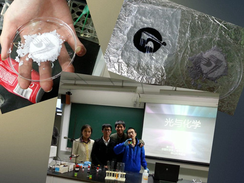 光可以引发化学反应。张帅琰给同学们介绍了人体内两个光引发的化学反应。暗视力是由于在光照下视黄醛发生了顺反构型变化;人体对钙的吸收需要维生素D的辅助,7-脱氢胆固醇合成维生素D的过程中,光照也是必不可少的。那么我们的生活中还有哪些光致化学反应呢?经过提示,同学们很快想到了胶卷底片上发生的卤化银见光分解反应,由此也引出了第一个演示实验——氯化银见光分解实验。在光照下,氯化银会转化为灰色的纳米级银颗粒,而避光条件下这个反应几乎不会发生。黄汉初用画有零陵中学校徽图案的塑料膜为同学们制作出了零陵中学的校徽。清晰的校徽图案印在氯化银“底片”上,一时间同学们的惊叹声此起彼伏。