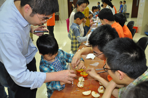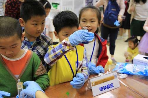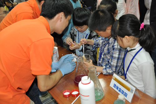 为了让大家更直观的体会到化学的奇妙,来自中国科学院有机氟化学重点实验室的志愿者们精心准备了10个妙趣横生的化学小实验:“牙膏中的氟元素”、“大象牙膏”、“碘钟反应”、“神奇的图画”、“水果电池”、“液体变软胶”、“热冰实验”、“人造雪”、“班氏试剂检测还原性糖”、“Fe3+的显色”。小实验具有氟化学的特色,又可以让大家亲自动手操作,让参观者真正感受到了化学的美妙。