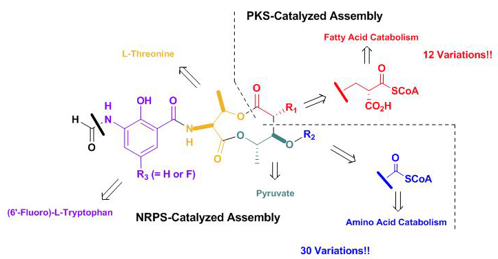 抗霉素是一类由链霉菌所产生,具有强烈抗真菌、抗虫和抗肿瘤等多种生物活性的聚酮-聚肽杂合类抗生素,也是化学生物学研究中经常使用的工具药物。课题组前期的研究表明(Org. Lett. 2012, 14 (16), 4142-4145),一套由非核糖体聚肽合成酶和聚酮合成酶组成的复合酶系负责了9元双内酯骨架的形成。抗霉素的生物合成逻辑具有普遍性,和其它许多聚酮、聚肽以及聚酮-聚肽杂合天然产物一样,包含了合成切块的制备、由非核糖体聚肽合成酶或聚酮合成酶催化的线性聚合和骨架后修饰等三个阶段。研究人员首先在生化层面鉴别了抗霉素生物合成中发生结构变化的决定因子,接着在技术层面综合运用了体内突变生物合成、途径修饰和体外化学酶催化的生物转化等多种手段,最后在策略层面将组合化学的思路应用于生物合成中起始单元的制备、延伸取代的选择和骨架后修饰的变化上。通过上述努力,研究人员一共获得了数百个双内酯天然产物类似物。其中,93.6%为新化合物,拥有大量药学上重要、化学上活泼或自然界中不存在的各种功能基团。