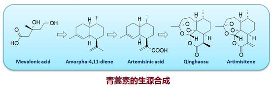 迄今植物化学研究显示青蒿素以及11-次甲基青蒿素(Artimisitene)是自然界仅有的含三噁烷结构单元的化合物。生源合成研究证明青蒿素是按通常杜松烷型倍半萜的合成途径经二羟甲戊酸(Mevalonic acid)、紫穗二烯(Amorpha-4,11-diene)合成到青蒿酸,后再由青蒿酸转化至青蒿素以及黄花蒿中同时微量存在的11-次甲基青蒿素,只是仍不清楚后一步需要光照下实现的转化是如何进行的,是否是酶催化的过程?由于近年青蒿素类药物需要大增,而青蒿素的原料基本依赖于中国,国外一些实验室在巨资资助下探索用基因工程的方法合成青蒿素,但至今还只能实现青蒿酸的合成,也正是由于还不清楚最后一步过氧基团引入的过程,无法合成到青蒿素。