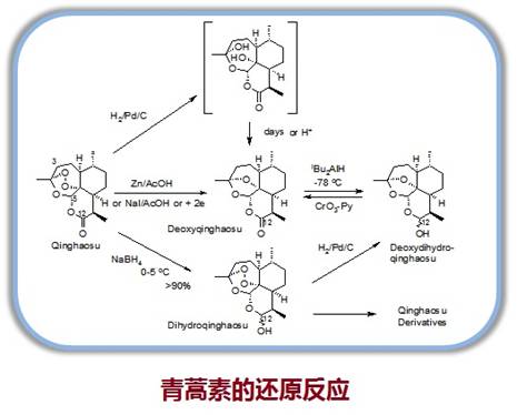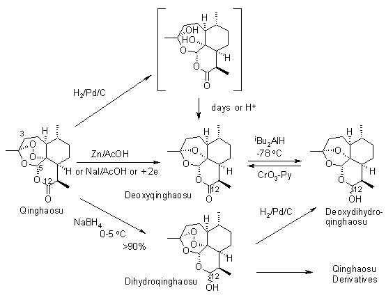 与一般的过氧化合物不同,青蒿素是一比较稳定的化合物,室温下可长期保存,190度时过氧裂解生成重排产物。稀酸条件下通常过氧基团可不受影响,而碱性条件下则过氧基团极易断裂生成多种产物。青蒿素最引人关注的反应是它的还原反应,氢化还原得脱氧青蒿素,醋酸-锌粉、醋酸-碘化钠和电化学还原也可得脱氧青蒿素(Deoxyqinghaosu),但后二个反应产率不高。脱氧青蒿素尽管只失去一个氧原子,但抗疟活性完全丧失,这是过氧基团为青蒿素抗疟活性基团最早的证明。青蒿素的硼氢试剂还原则能在完全保留过氧基团的情况下,选择性地还原内酯得内半缩醛的二氢青蒿素(Dihydroqinghaosu)。二氢青蒿素为12-位a和b-羟基的混合物(约4:6),它保留了过氧基团也同时显示比青蒿素更高的抗疟活性,这也进一步说明过氧基团是青蒿素抗疟作用的关键活性基团,与此同时,二氢青蒿素也为青蒿素衍生物的制备成为可能。钠硼氢还原青蒿素得到二氢青蒿素这一反应在学术上也是一十分有意义的现象,因为在这一反应条件下(甲醇溶液中0-5度),一般的内酯是不能被还原,即使结构十分接近的脱氧青蒿素也不能被还原,脱氧青蒿素只能由通常的内酯还原试剂二异丁基铝氢还原成脱氧二氢青蒿素(Deoxydihydroqinghaosu)。
