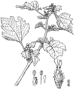 苍耳,一年生草本,高20-90cm。根纺锤状,分枝或不分枝。茎直立不分枝或少有分枝,下部圆柱形,上部有纵沟,被灰白色糙伏毛。叶互生;有长柄,长3-11cm;叶片三角状卵形或心形,长4-9cm,宽5-10cm,近全缘,或有3-5不明显浅裂,先端尖或钝,基出三脉,上面绿色,下面苍白色,被粗糙或短白伏毛。头状花序近于无柄,聚生,单性同株;雄花序球形,总苞片小,1列,密生柔毛,花托柱状,托片倒披针形,小花管状,先端5齿裂,雄蕊5,花药长圆状线形;雌花序卵形,总苞片2-3列,外列苞片小,内列苞片大,结成囊状卵形,2室的硬体,外面有倒刺毛,顶有2圆锥状的尖端,小花2朵,无花冠,子房在总苞内,每室有1花,花柱线形,突出在总苞外。 |