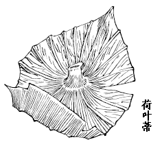 本品为荷叶中央近叶柄外剪下的叶片,近圆形、半圆形或菱形,直径6-7cm。上面紫褐色或绿黄色,较粗糙,叶脉微凹,作辐射状散出,下面棕黄色,有光泽,中央有残存叶柄基,叶脉突起。质轻面松脆。气微,味涩。