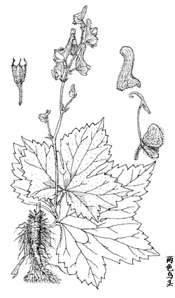 两色乌头是多年生草本。根圆柱形, 长10-15cm。茎缠绕,长1-2.5m,疏被反曲的短柔毛。叶互生;基生叶和茎下部叶具长柄,柄长达20cm;叶片五角状肾形,长6.5-12cm,宽9.5-22cm,基部心形,3深裂至近中部,中央深裂片菱形,侧深裂片不等2浅裂,浅裂片上部不明显3浅裂,边缘具粗牙齿,两面疏被短伏毛。总状花序,长6-14cm,具花3-8朵;花序轴及花梗密被伸展的短柔毛;苞片线形,长3-3.5mm;花梗长5-9mm;小苞片生花梗的基部或中部;两性花,两侧对称;萼片5,花瓣状,上萼片圆筒形,长1.3-2cm,喙短,稍向下弯,下缘长1-1.3cm,淡紫色,被伸展的柔毛;花瓣2,与上萼片近等长,距细,比唇长,拳卷,无毛;雄蕊多数,花丝全缘,无毛;心皮3,被毛或无毛。蓇葖果,长约1.2cm。种子多数,倒圆锥状三角形,长约2.5mm,生横狭翅。花期8-9月,果期9-10月。 |