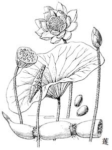 莲为多年生水生草本。根茎横生,肥厚,节间膨大,内有多数纵行通气孔洞,外生须状不定根。节上生叶,露出水面;叶柄着生于叶背中央,粗壮,圆柱形,多刺;叶片圆形,直径25-90cm,全缘或稍呈波状,上面粉绿色,下面叶脉从中央射出,有1-2次叉状分枝。花单生于花梗顶端,花梗与叶柄等长或稍长,也散生小刺;花直径10-20cm,芳香,红色、粉红色或白色;花瓣椭圆形或倒卵形,长5-10cm,宽3-5cm;雄蕊多数,花药条形,花丝细长,着生于花托之下;心皮多数,埋藏于膨大的花托内,子房椭圆形,花柱极短。花后结“莲蓬”,倒锥形,直径5-10cm,有小孔20-30个,每孔内含果实1枚;坚果椭圆形或卵形,长1.5-2.5cm,果皮革质,坚硬,熟时黑褐色。种子卵形,或椭圆形,长1.2-1.7cm,种皮红色或白色。花期6-8月,果期8-10月。 |