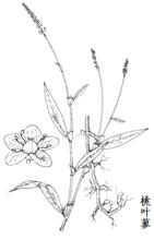 桃叶蓼为一年生草本,高40-80cm。主根弯曲。茎上部直立,单一或分枝。叶互生;有短柄,有硬刺毛;叶片披针形或狭披针形,上面常有褐色斑点,背面绿色,长4-10cm,宽0.5-2cm,先端长渐尖,基部楔形,主脉及叶缘有硬刺毛;托叶鞘筒状,膜质,上部明显,紧紧抱茎,长1-2.2cm,有稀疏伏柔毛,先端截形,有短睫毛。花多数,集成圆锥花序,顶生或腋生,花序梗微有腺;花密生,长1.5-5cm,通常直立,苞漏斗状,紫红色,先端斜形,疏生睫毛,花被粉红色或白色,通常5深裂,覆瓦状排列;雄蕊7或8,6枚能育;花柱2,稀3。瘦果广卵形,黑褐色,有光泽,包于宿存的花被内。花、果期6-9(10)月。
