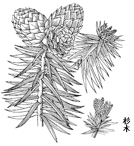 杉木 常绿乔木,高达30m,胸围达2.5-3m。幼树树冠尖塔形,大树树冠圆锥形。树皮灰褐色,裂成长条片脱落。大枝平展,小枝近对生或轮生。叶在主枝上辐射伸展,在侧枝上排成二列状,条状披针形,革质,微弯,坚硬,长2-6cm,边缘有细齿,上面中脉两侧有窄气孔带、下面沿中脉两侧各有1条白粉气孔带。雌雄同株;雄球花圆锥状,簇生枝顶;雌球花单生或2-4个集生枝顶,卵圆形,苞鳞与珠鳞结合而生,珠鳞先端3裂,腹面具3胚珠。球果近球形或卵圆形,长2.5-5m,径3-4cm,苞鳞三角状宽卵形,宿存。种子长卵形,扁平,长6-8mm,宽约5mm,暗褐色,两侧有窄翅。花期4月,球果10月下旬成熟。