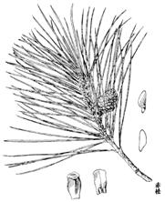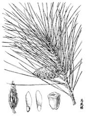 2、油松属乔木,高达25m,胸围可达1m以上。树皮灰褐色,呈不规则鳞甲状裂,裂隙红褐色。枝轮生,小枝粗壮,淡橙黄色或灰黄色;冬芽宽椭圆形,先端尖,红褐色。叶针形,2针一束,深绿色,粗硬,长10-15cm,径约1.5mm,边缘有细齿,两面有气孔线;叶鞘初时淡褐色,渐变成暗灰色。雄球花圆柱形,长1.2-1.8cm,在新枝上聚生成穗状;雌球花序阔卵形,长7mm,紫色,着生于当年新枝上。球果卵形或圆卵形,长4-9cm,有短梗,向下弯垂,熟时淡黄色或淡褐黄色,宿存数年之久;中部种鳞近长圆状倒卵形,长1.6-2cm,鳞盾肥厚,隆起或微隆起,扁菱形或菱状多角形,横脊显著,鳞脐凸起有尖刺。种子卵圆形或长卵圆形,淡褐色,有斑纹,连翅长1.5-1.8cm。花期4-5月,果熟期翌年10月。