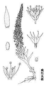 2.晚红瓦松为二年生草本。第1年生仅有莲座叶,肉质,狭匙形或披针形,长1.5-3cm,宽4-7mm,先端长渐尖,微弯曲,有软骨质刺,全缘或具微细的波状齿;第2年从莲座叶中抽出花茎,高10-40cm,直立,全株被白粉,密生棕红色腺点;花茎上的叶线形至线状披针形,长2-6cm,宽3-7mm,先端长渐尖,干后有红色斑点。总状花序圆锥形,花密集,花序间有叶状苞片,卵状披针形或镰刀形;萼片5,长约4mm;花瓣5,白色或淡红色,线状披针形,长4-6mm,宽1.8mm;雄蕊10,2轮,较花瓣稍短,花药暗紫色;鳞片5,近四方形,先端有微缺;心皮5,直立,分离,基部急狭,花柱细,长2mm。裚果,长约5mm。种子长约1mm,褐色。花期8-9月,果期9-11月。