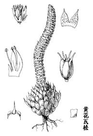 4.黄花瓦松亦为二年生草本。第1年植株形成莲座丛,密生莲座叶,叶片长圆形,先端有一半圆形白色软骨质附属物,中央有1个2-4mm长的刺;第2年自莲座丛中抽出花茎,高10-30cm;花茎上的叶互生,无柄,宽线形至倒披针形,长1-3cm,宽2-5mm,先端渐尖,有软骨质的刺。花序穗状或呈总状,顶生,长5-20cm;花梗长约1mm或无梗;苞片披针形至长圆形,长达4mm,先端渐尖,有刺尖;萼片5,卵状长圆形,长2-3mm,先端有刺尖,有红色斑点;花瓣5,黄绿色,卵状披针形,长5-7mm,宽1.5mm;雄蕊10,较花瓣稍长;鳞片5,近正方形,长约0.7mm,先端微缺;心皮5,披针形。裚果,椭圆状披针形,长5-6mm,缘长1.5mm。种子长圆状卵形。花期7-8月,果期9月。