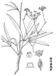1.竹叶西风芹是多年生草本,高20-80cm。全株光滑无毛。根圆柱形,不分枝或1-2分枝,灰褐色,表面不平整,味略甜,根颈粗短,残留众多短小叶鞘纤维。茎单一,中部以上有少数分枝,圆柱形,粗2-4mm,光滑无毛。基生叶2至多数;叶柄长至18cm,叶片稍革质,略带粉绿色,一至二回三出式分裂,第一回羽片分裂处呈关节状,椭圆形至线状披针形,先端急尖,长2-12cm,宽2-12mm,偶至4cm,全缘,边缘反曲,近平行脉3-10条,表面叶脉稍突起,背面叶脉显著突起;茎中部叶与基生叶相似,裂片稍狭,上部叶线形,常不分裂;序托叶短小,线形。伞辐5-7,长1.5-3.5cm;小总苞片6-10,基部联合,披针形或卵状披针形;小伞形花序有花12-18;花瓣黄色或淡黄色,近方形、长圆形或肾形,有3条棕红色脉纹,以中间一条最显著;萼齿细尖;花柱基圆锥形,较厚,有缺裂。分生果卵状长圆形,略带紫色,横剖面略呈五角形,背棱细,稍突起;每棱槽内有油管1-2,合生面有油管4。花期8-9月,果期9-10月。