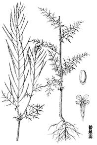 该植物为一年生或二年生草本,高20-80cm。全株呈灰白色。茎直立,上部分枝,具纵棱槽,密被分枝状短柔毛。叶轮廓为长圆形或长圆状披针形,长3-7cm,宽1-4cm,二至三回羽状全裂或深裂,最终裂片条形或条状长圆形,长2-5mm,先端钝,全缘,两面被分枝短柔毛;茎下部叶有叶柄,向上叶柄逐渐缩短或近于无柄。总状花序顶生,具多数花;萼片4,条状长圆形,先端钝,长约2mm,边缘膜质,背面有分枝细柔毛;花瓣黄色,匙形,与萼片近等长;雄蕊6,几与花瓣等长,基部并有爪;雌蕊1,子房圆柱形,花柱短,柱头呈扁压的头状。长角果圆筒状,长2.5-3cm,无毛,稍内曲,与果梗不成直线,果瓣中脉明显。种子每室1行,形小,多数,长圆形,稍扁,淡红褐色,表面有细网纹,潮湿后有粘胶物质。花、果期为4-7月。