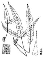 金鸡脚是植株高10-35cm。根茎细长,横生,与叶柄基部密被红棕色、狭披针形鳞片,先端长渐尖,基部近圆形,盾状着生,边缘略有齿。叶疏生;叶柄长5-20cm,禾秆色,基部有关节,向上光滑;叶片厚纸质,通常3裂,偶有5裂或2裂,长5-15cm,宽4-10cm,基部圆楔形或圆形;裂片披针形,长5-10cm,宽1-2cm,中间1片最长,先端渐尖,全缘或略呈波状,有软骨质狭边,两面光滑;中脉与侧脉两面均明显,小脉网状,有内藏小脉。孢子囊群圆形,沿中脉两侧各成1行,位于中脉与叶边之间。 |