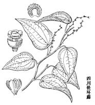 四川轮环藤是草质藤本,有时老茎稍变木质,除苞片外全株无毛。茎纤细而长,具纵条纹。叶柄在叶片近基部盾状着生;叶薄革质或纸质,披针形或长卵形,长5-15cm,宽2-5.5cm,先端渐尖或尾状渐尖,基部圆形,全缘,干时变褐色,掌状脉3-5条。花序腋生,总状花序式,有时为穗状花序式,长可达20cm;雄花序较纤弱;雄花萼片4,仅基部合生,椭圆形或卵状长圆形,长约2.5mm;花瓣4,分离或合生,聚药雄蕊有4个花药;雌花萼片2,花瓣2,微小,贴生于萼片基部。核果红色,内果皮长约7mm,背部两侧各有3行小疣状雕纹。