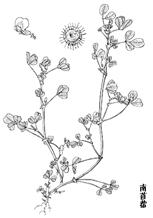南苜蓿一年生或多年生草本。茎匍匐或稍直立,高约30cm,基部多分枝。三出复叶;小叶柄长约5mm,有柔毛;托叶卵形,长约7mm,宽约3mm,边缘有细裂锯齿。叶片阔倒卵形或倒心形,长1-1.5cm,宽0.7-1cm,先端钝圆或微凹,有细锯齿,基部楔形,上面无毛,下面被疏柔毛,两侧小叶略小。总状花序腋生,有花2-6朵;花萼钟状,深裂,萼齿披针形,有疏柔毛;蝶形花冠,黄色,旗瓣倒卵形,翼瓣椭圆形,龙骨瓣直立;雄蕊10,二体。荚果螺旋形,直径约0.6cm,边缘具有钩的刺。种子3-7颗,肾形,黄褐色。花期4-5月,果期5-6月。