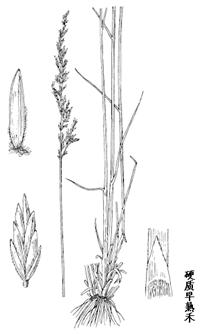 硬质早熟禾为禾本科植物硬质早熟禾的地上部分,该植物是多年生草本。秆直立,丛生,高30-60cm,有3-4节,顶节位于下部1/3-1/2处,花序以下以及节下处常粗糙而涩。叶鞘无脊,无毛,基部叶鞘有时为淡紫色;叶舌膜质,长约4mm,叶片扁平,稍粗糙,长3-7cm,宽约1mm。圆锥花序紧缩几成穗状;小穗绿色,成熟后草黄色,长5-7mm,有4-6朵小花;颖为被针形,先端有极狭的膜质,膜质下常带黄铜色,脊下部2/3处,和边脉下部1/2处有长柔毛,基部有绵毛;第1外稃长约3mm,内稃和外稃等长,或上部小花的内稃稍长于外稃。花、果期5-8月。