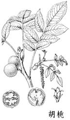 化合物成分:谷氨酸(glutamic acid)、精氨酸(arginine)、天冬氨酸(aspartic acid)。甾醇脂、亚酸(linoleic acid)、油酸(oleic acid)、亚麻酸(linolenic acid)、β-谷甾醇(β-sitosterol)、菜油甾醇(campesterol),豆甾醇(stigmasterol),燕麦甾-5-烯醇、豆甾-7-稀醇、异亮氨酸(isoleucine)、亮氨酸(leucine)、色氨酸(tryptophan)、苯丙氨酸(phenylalanie)、缬氨酸(valine)、苏氨酸(threonine)、赖氨酸(lysine)、1,4-萘醌(1,4-naphthoquinone)、胡桃叶醌(juglone)、4-羟基-1-萘基-β-D-吡喃葡萄糖甙(4-hydroxy-1-naptaleny-β-D-glucopyranoside)、4,8-二羟基-1-萘基-β-D-吡喃葡萄糖甙(4,8-di-hydroxy-1-naphthalenyl-β-D-glucopyranoside)、钾、钙、铁、锰、锌、铜、锶等多种微量元素、维生素C。