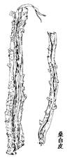 桑是落叶灌木或小乔木,高3-15m。树皮灰白色,有条状浅裂;根皮黄棕色或红黄色,纤维性强。单叶互生;叶柄长l-2.5cm;叶片卵形或宽卵形,长5-20cm,宽4-10cm,先端锐尖或渐尖,基部圆形或近心形,边缘有粗锯齿或圆齿,有时有不规则的分裂,上面无毛,有光泽,下面脉上有短毛,腋间有毛,基出脉3条与细脉交织成网状,背面较明显;托叶披针形,早落。花单性,雌雄异株;雌、雄花序均排列成穗状葇荑花序,腋生;雌花序长l-2cm,被毛,总花梗长5-10mm;雄花序长1-2.5cm,下垂,略被细毛;雄花具花被片4,雄蕊4,中央有不育的雌蕊;雌花具花被片4,基部合生,柱头2裂。瘦果,多数密集成一卵圆形或长圆形的聚合果,长l-2.5cm,初时绿色,成熟后变肉质、黑紫色或红色。种子小。花期4-5月,果期5-6月。