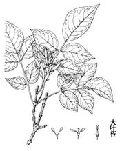 1.大叶梣是落叶大乔木,高12-15m。树皮灰褐色,光滑,老时浅裂。冬芽阔卵形,先端尖,黑褐色,具光泽,内侧密被棕色曲柔毛。当年生枝淡黄色,通直,无毛,去年生枝暗褐色,皮孔散生。叶轴上面具浅沟,小叶着生处具关节,节上有时簇生棕色曲柔毛;小叶5-7枚,革质,阔卵形、倒卵形或卵状披针形,长3-11cm,宽2-6cm,营养枝的小叶较宽大,顶生小叶显著大于侧生小叶,下方1对最小,先端渐尖、骤尖或尾尖,基部钝圆,叶缘呈不规则粗锯齿,齿尖稍向内弯,有时也呈波状,通常下部近全缘,沿脉腋被白色柔毛,渐秃净。圆锥花序顶生或腋生于当年生枝梢,长约10cm;苞片长披针形,长约5mm,早落;花梗长约5mm;雄花与两性花异株;花萼浅杯状,长约1mm,萼片三角形无毛;无花冠;两性花具雄蕊2,长约4mm;雌蕊具短花柱,柱头2叉深裂;雄花花萼小,花丝细,长达3mm。翅果线形,先端坚果长约1cm,略隆起;具宿存萼。花期4-5月,果期9-10月。