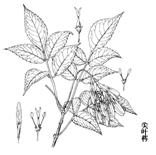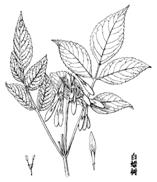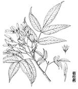 2.尖叶梣 本种与大叶腀的不同点在于:小枝、叶轴和小叶下面被毛。小叶3-5(-7)片,小叶先端长渐尖至尾尖,下面常在中脉基部被白色柔毛。花无花冠,与叶同时开放;花萼杯状,与坚果基部疏离。