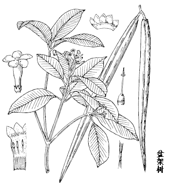 盆架树是常绿乔木,高达30m,直径1.2m。枝轮生;树皮灰黄色,具纵裂条纹,受伤后流出大量白色乳汁,有浓烈的腥甜味。叶3-4片轮生,间有对生;叶柄长1-2cm;叶片薄革质,长圆状椭圆形,长7-20cm,宽2.5-4.5cm,先端渐尖呈尾状或急尖,基部楔形或钝,两面无毛;侧脉每边20-50条。横出近平行,叶缘网结,两面凸起。聚伞花序顶生,着花多数;花萼5,裂片卵圆形,具缘毛;花冠白色,高脚碟状,花冠筒外面被柔毛,内面被长柔毛,喉部更密,花冠裂片5,广椭圆形;雄蕊5,着生于花冠筒中部,花药先端不伸出花冠喉外,花丝短;无花盘;子房由2枚合生心皮组成,花柱圆柱状,柱头先端2裂。蓇葖合生,长18-35cm,直径1-1.2cm,外果皮暗褐色,有纵浅沟;种子长椭圆形,扁平,长约1cm,两端被棕黄色的缘毛。花期4-7月,果期8-12月。 |