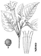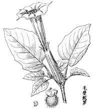 2.毛曼陀罗 一年生草本,高1-2m。有恶臭,全株被白色细腺毛及短柔毛。茎粗壮,直立,圆柱形,基部木质化,上部多呈叉状分枝,灰绿色。叶互生或近对生;叶片广卵形,长8-20cm,宽5-12cm,先端急尖,基部斜心形,全缘或呈微波状,背面叶脉隆起。花大,直立或斜升,长15-20cm,直径7-8cm,花冠白色或淡紫色,具5棱;花萼筒部有5棱角,先端5浅裂,花后自近基部断裂,宿存部分随果实而增大并向外反折。蒴果生于下垂的果梗上,近圆形,密生柔韧针状刺并密被短柔毛,熟时先端不规则裂开。种子多数,肾形,淡褐色或黄褐色。花期5-9月,果期6-10月。 |