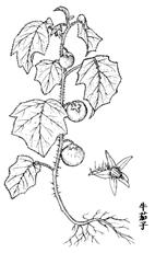 牛茄子是多年生直立草本至亚灌木,高30-60cm。植物体除茎、枝外各部均被具节的纤毛,茎及小枝具淡黄色细直刺。叶单生或成对互生;叶柄粗壮,长2-5cm;叶片宽卵形,长5-14cm,宽4-12cm,先端短尖,基部心形,5-7裂或中裂,裂片三角形或近卵形,脉上有直刺。聚伞花序腋外生,短而少花;花梗纤细,被直刺及纤毛;萼杯状,有刺,5裂;花冠白色,5裂,裂片披针形,端尖;雄蕊5,着生于花冠喉上,花药顶裂;子房球形,2室,胚珠多数。浆果扁球形,直径约3.5cm,初绿白色,成熟后橙红色,基部有带细刺的宿存萼,果柄长2-2.5cm,具细直刺;种子干后扁而薄,边缘翅状,直径约4mm。花、果期1-11月。 |