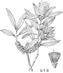 白千层Melaleuca leucadendron L. [Myrtus leucadendra Linn.]又名:王树《中国药用植物图鉴》,白树《广西药用植物名录》。乔木,高达18m。树皮灰白色,厚而松软,呈薄层状剥落。嫩枝灰白色。叶互生;叶柄极短;叶片革质,披针形或狭长圆形,长4~10cm,宽1~2cm,两端尖,全缘,油腺点多,香气浓郁;基出脉3~7条。花白色,密集于枝顶成穗状花序,花序轴常有短毛;萼管卵形,长3mm,有毛或无毛,萼齿5,圆形,长约1mm;花瓣5,卵形,长2~3mm,宽3mm;雄蕊多数,绿白色,长约1cm,常5~8枚成束,花药背部着生,药室平行,纵裂;子房下位,与萼管合生,先端突出,3室,花柱线形,比雄蕊略长,柱头多少扩大。蒴果近球形,直径5~7mm,种子近三角形。花期每年多次。百千层生于较干的沙地上,多为栽培。福建、台湾、广东、海南、广西等地均有栽培。原产澳大利亚。