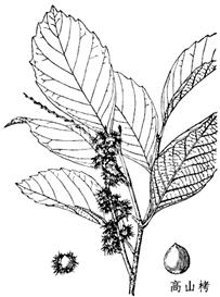 高山栲Castanopsis delavayi Franch又名:白栗《树木学》,高山锥《中国树木志》,毛栗、丝栗《中国高等植物图鉴》,白珠栎《云南树木图志》。高山栲为常绿乔木,高20~25m。树皮暗灰色或灰褐色,纵裂。幼枝无毛,有时有粉白色鳞秕。叶互生;叶柄长1.5~2.5cm;叶片硬革质,卵形或倒卵状椭圆形,长5~13cm,宽3.5~9cm,先端钝或短尖,基部宽楔形或近圆形,中部以上疏生锯齿或波状齿,无毛,下面幼时被黄棕色鳞秕,老时被银灰色或灰白色紧贴的蜡层,叶面中脉在上面微突起,侧脉6~9对,支脉较明显。花单性,雄花序常呈圆锥状,轴密生黄褐色鳞秕;雌花单朵生于苞内。果序长8~15cm,每壳斗具1果;壳斗宽卵形至近球形,常有短柄,顶端破裂,连刺直径1.5~2cm,高1.2~1.8cm,熟时2瓣裂,刺常基部连生成3~5刺环,刺长3~6mm,稀达1cm,壳斗壁可见;坚果宽卵形至球形,直径1~1.5cm,高1~1.4cm,顶部疏被平伏毛,果脐小于坚果底部。花期4~5月,果期翌年9~11月。生于海拔500~2800m的针阔叶混交林或杂木林中。分布于广西(西南部)、四川(南部)、贵州(西南部)、云南(南部)等地。