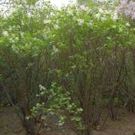 白花欧丁香Syringa vulgaris L. f. alba(Weston) Voss. [S. vulgaris L. var alba Weston]又名:白花洋丁香《中国树木分类学》。灌木或小乔木,高达7m。小枝、叶柄、叶片两面、花序轴、花梗和花萼均无毛,或具腺毛,老时脱落。小枝棕褐色,疏生皮孔。单叶对生;叶柄长1~3cm;叶片卵形、宽卵形或长卵形,长3~13cm,宽2~9cm,先端渐尖,基部截形、宽楔形或心形,上面绿色,下面淡绿色。花两性;花序轴疏生皮孔;萼齿锐尖至短渐尖;花冠白色,芳香;雄蕊2,花药黄色,位于距花冠喉部1~2mm。