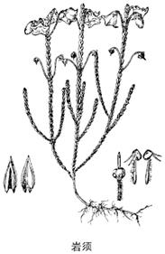 岩须Cassiope selaginoides Hook. f. et Thoms. [C. mariei. Lévl.]又名:长梗岩须《峨眉植物图志》。该植物为常绿矮小半灌木,高5~25cm。分枝多而密,有时铺散成垫状,小枝密生交互对生的叶。叶硬革质,披针形至披针状长圆形,长2~3mm,宽1~1.7mm,基部稍宽,2裂,叉开,顶端稍钝,幼时具一紫红色芒刺,背面有光泽,龙骨状突起,有一深纵沟槽,腹面近凹陷,被微毛,边缘疏齿状或全缘。花单个腋生,下垂,花梗长1.5~2.2cm,被蛛丝状长柔毛;花萼5,绿色或紫红色,裂片卵状披针形或披针形;花冠乳白色,宽钟状,长7~10mm,口部5浅裂,裂片宽三角形;雄蕊10,较花冠短,花丝被柔毛。蒴果球形,直径5~8mm,花柱宿存。花期4~5月,果期6~7月。生于海拔2000~4000m的灌丛中或垫状灌丛草地。分布于四川西部、云南西北部、西藏东南部。